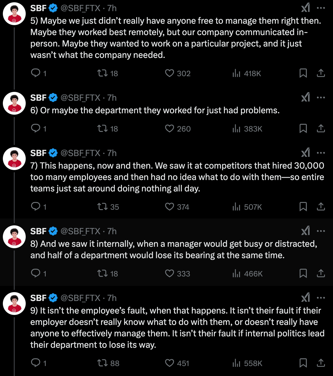 And just when we thought today couldn’t get any more bizarre, Sam Bankman-Fried made a surprise return to X. Yes, that SBF. His first public comment after he was arrested? His cryptic message about having "sympathy for government employees" arrived just as Elon Musk’s companies prepare for potential mass layoffs in federal agencies—a strange coincidence or an intentional jab? Btw, my boss has asked I send weekly mail on what i achieved the previous week, thanks alot Mr. Elon of DOGE. 😭